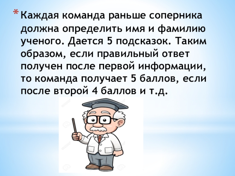 Слайд 3Каждая команда раньше соперника должна определить имя и фамилию ученого. Дается