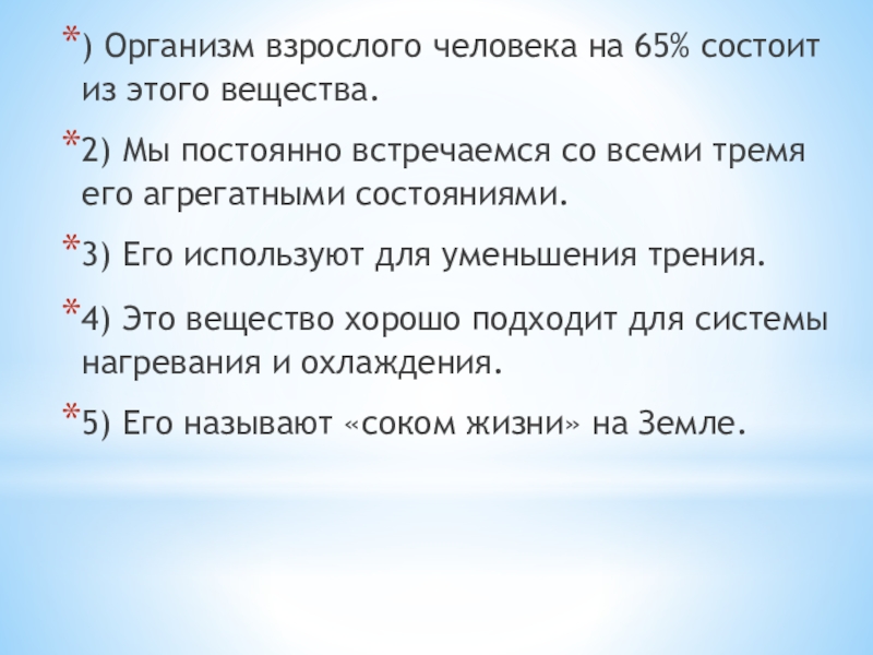 Слайд 15) Организм взрослого человека на 65% состоит из этого вещества.