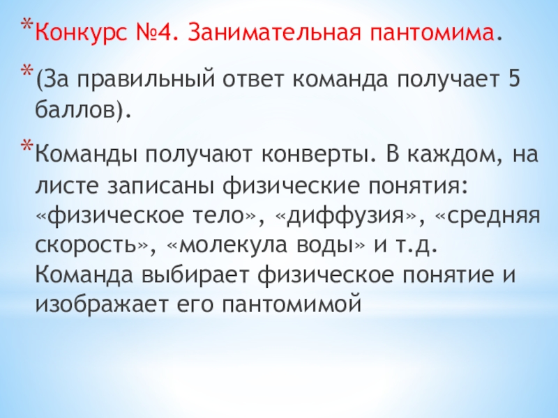 получают конверты. В каждом, на листе записаны физические понятия: «физическое тело», «диффузия», «средняя скорость», «молекула воды» и т.д. Команда выбирает физическое понятие и изображает его пантомимой