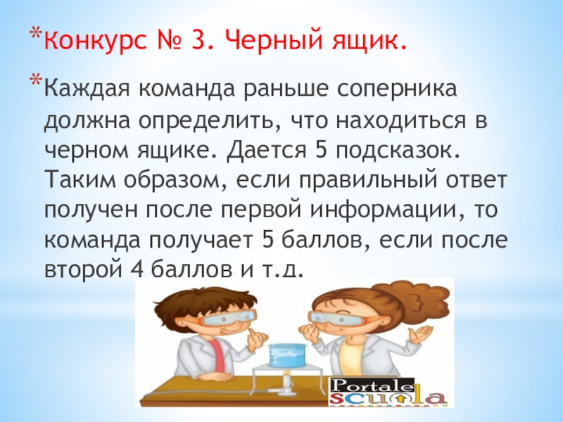 что находиться в черном ящике. Дается 5 подсказок. Таким образом, если правильный ответ получен после первой информации, то команда получает 5 баллов, если после второй 4 баллов и т.д.