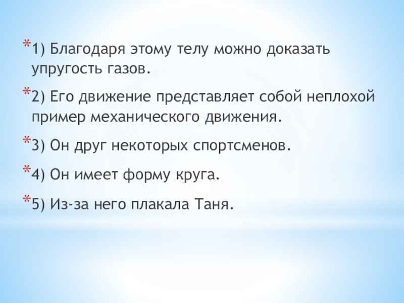 Слайд 131) Благодаря этому телу можно доказать упругость газов.
