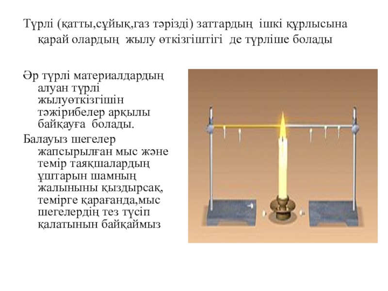 Балауыз шегелер жапсырылған мыс және темір таяқшалардың ұштарын шамның жалыныны қыздырсақ,темірге қарағанда,мыс шегелердің тез түсіп қалатынын байқаймыз