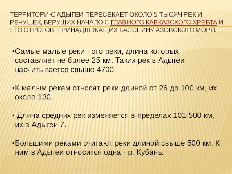 Самые малые реки - это реки, длина которых составляет не более 25 км. Таких рек в Адыгеи насчитывается свыше 4700.