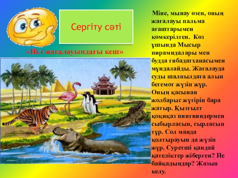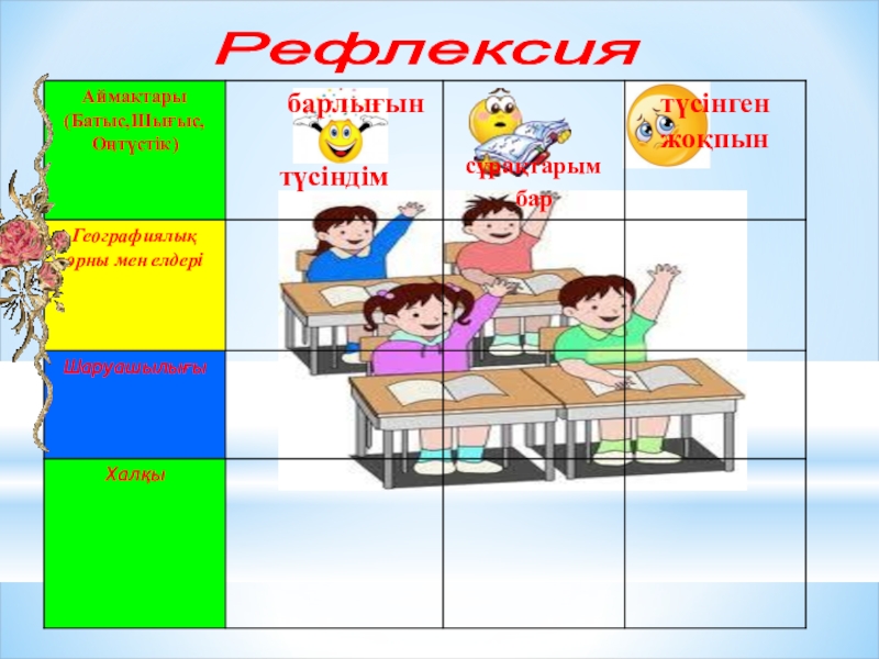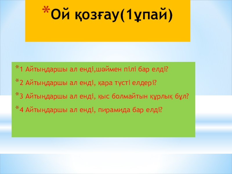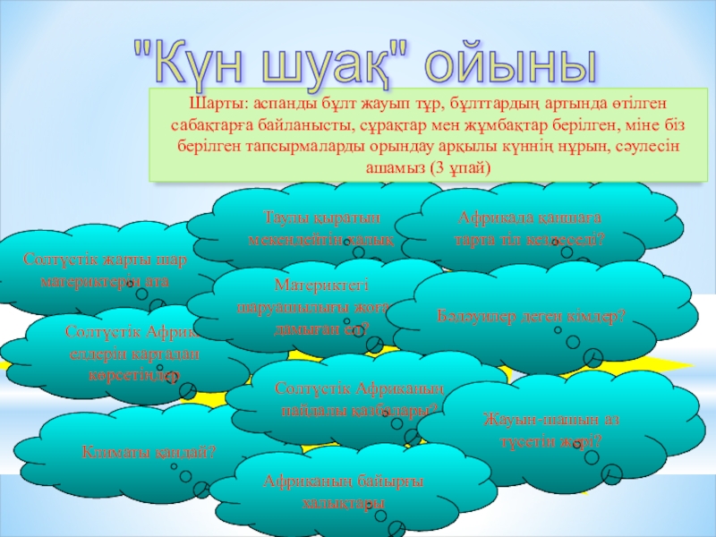 Шарты: аспанды бұлт жауып тұр, бұлттардың артында өтілген сабақтарға байланысты, сұрақтар мен жұмбақтар берілген, міне біз берілген тапсырмаларды орындау арқылы күннің нұрын, сәулесін ашамыз (3 ұпай)
