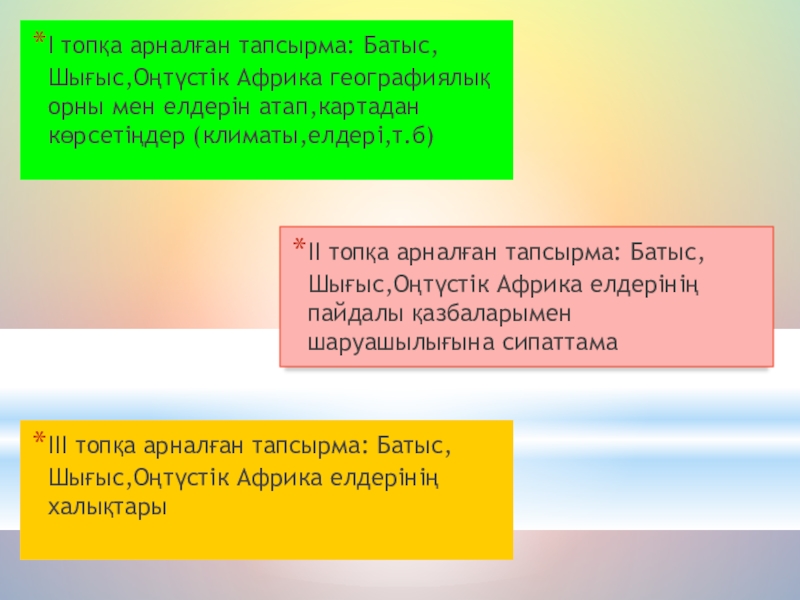 ІІ топқа арналған тапсырма: Батыс,Шығыс,Оңтүстік Африка елдерінің пайдалы қазбаларымен шаруашылығына сипаттама