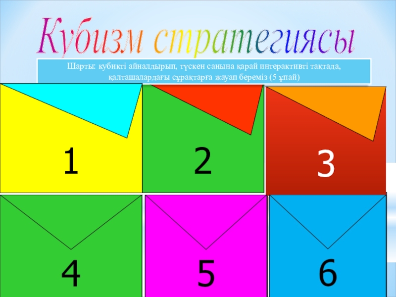 Шарты: кубикті айналдырып, түскен санына қарай интерактивті тақтада, қалташалардағы сұрақтарға жауап береміз (5 ұпай)