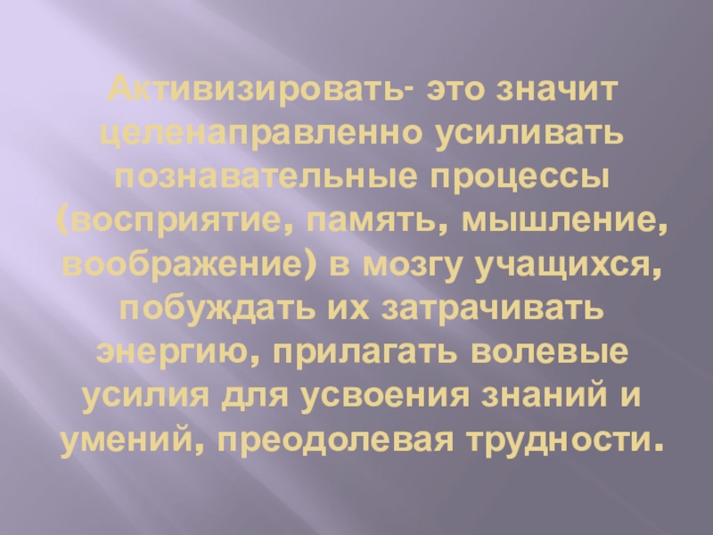 Слайд 5Активизировать- это значит целенаправленно усиливать познавательные процессы (восприятие, память, мышление, воображение)
