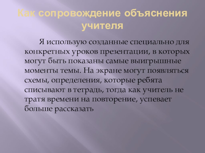 созданные специально для конкретных уроков презентации, в которых могут быть показаны самые выигрышные моменты темы. На экране могут появляться схемы, определения, которые ребята списывают в тетрадь, тогда как учитель не тратя времени на повторение, успевает больше рассказать