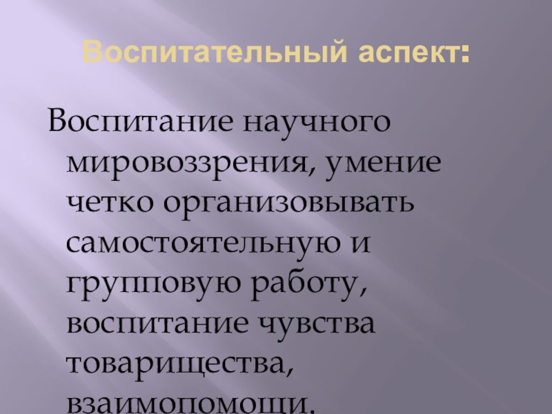 Воспитание научного мировоззрения, умение четко организовывать самостоятельную и групповую