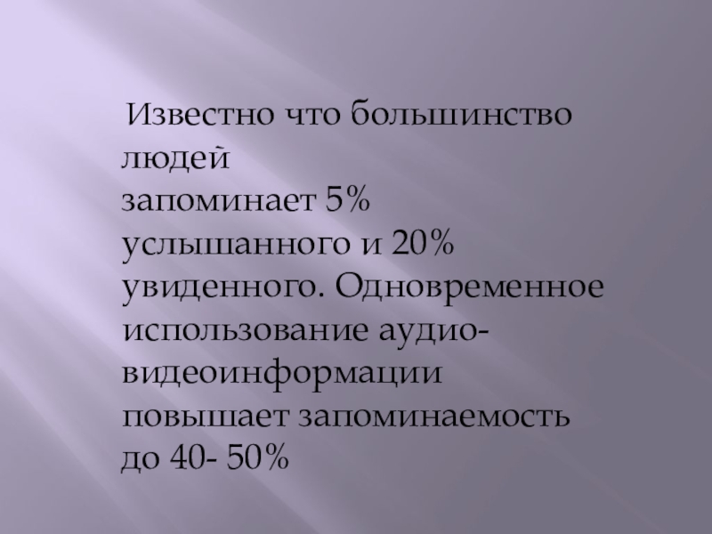 запоминает 5% услышанного и 20% увиденного. Одновременное использование аудио-видеоинформации повышает запоминаемость до 40- 50%