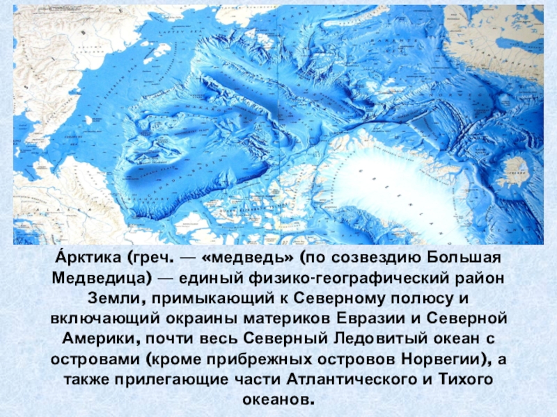 Слайд 2А́рктика (греч. — «медведь» (по созвездию Большая Медведица) — единый физико-географический район Земли, примыкающий