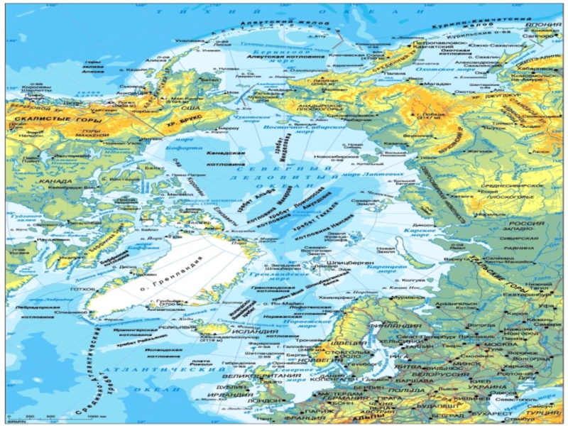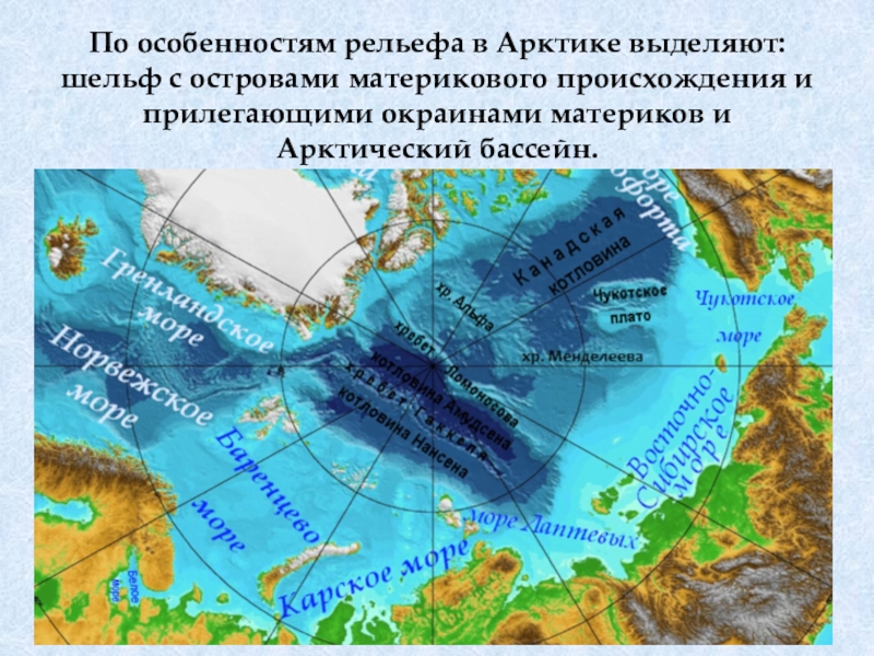 По особенностям рельефа в Арктике выделяют: шельф с островами материкового происхождения и прилегающими окраинами материков и Арктический
