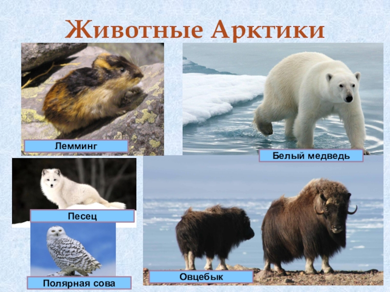 Животные АрктикиПесецЛеммингОвцебыкБелый медведьПолярная сова