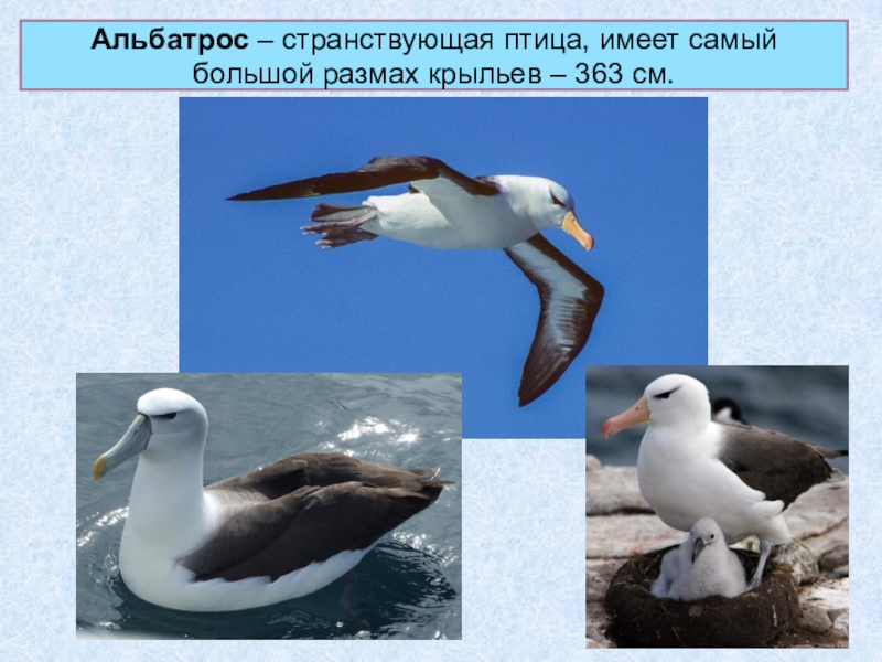 Слайд 8Альбатрос – странствующая птица, имеет самый большой размах крыльев – 363