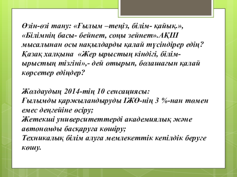 мысалынан осы нақылдарды қалай түсіндірер едің? Қазақ халқына «Жер ырыстың кіндігі, білім- ырыстың тізгіні»,- дей отырып, болашағын қалай көрсетер едіңдер?