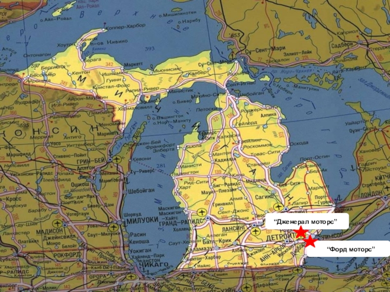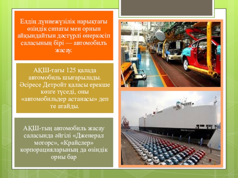 бірі — автомобилъ жасау. АҚШ-тағы 125 қалада автомобиль шығарылады. Әсіресе Детройт қаласы ерекше көзге түседі, оны «автомобильдер астанасы» деп те атайды. 1896 жылы Детройт маңындары Дирборн қаласында Генри Форд алғаш рет автомобильді конвейерлік әдіспен шығаруды игеріп «Форд моторс» автомобиль компаниясын ұйымдастырған болатын. Қазіргі кезде бұл кәсіпорын дүние жүзіндегі ірі ұлтаралық концернге айналды: компанияның құрамына енетін кәсіпорындарды әлемнің әр түкпірінен кездестіруге болады. АҚШ-тың автомобиль жасау саласында әйгілі «Дженерал моторс», «Крайслер» корпорацияларының да өзіндік орны бар.