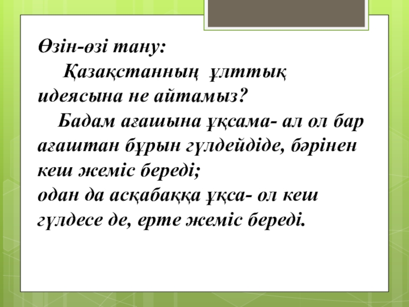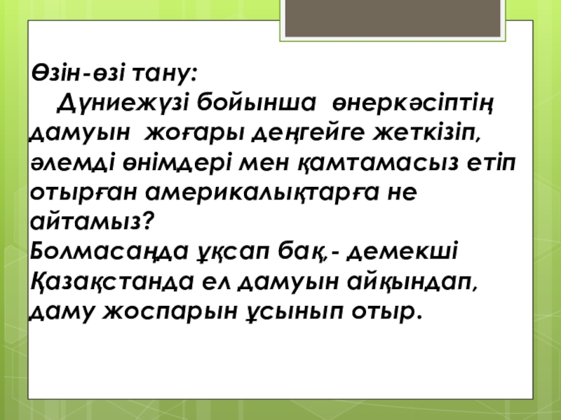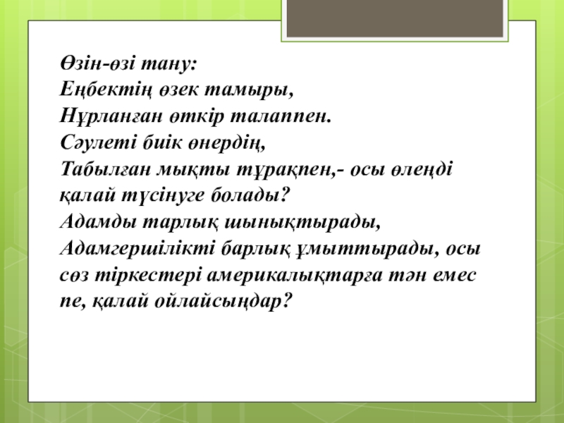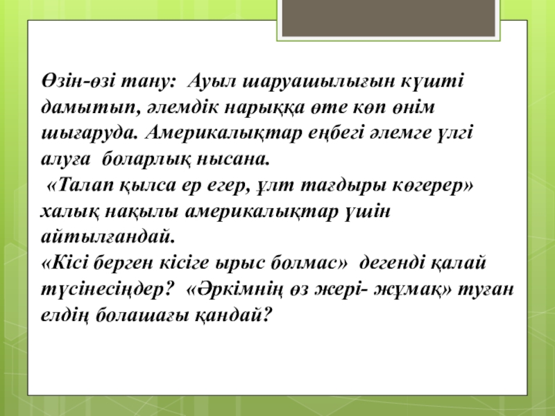 Слайд 95Өзін-өзі тану: «Ғылым –теңіз, білім- қайық.», «Білімнің басы- бейнет, соңы зейнет».АҚШ