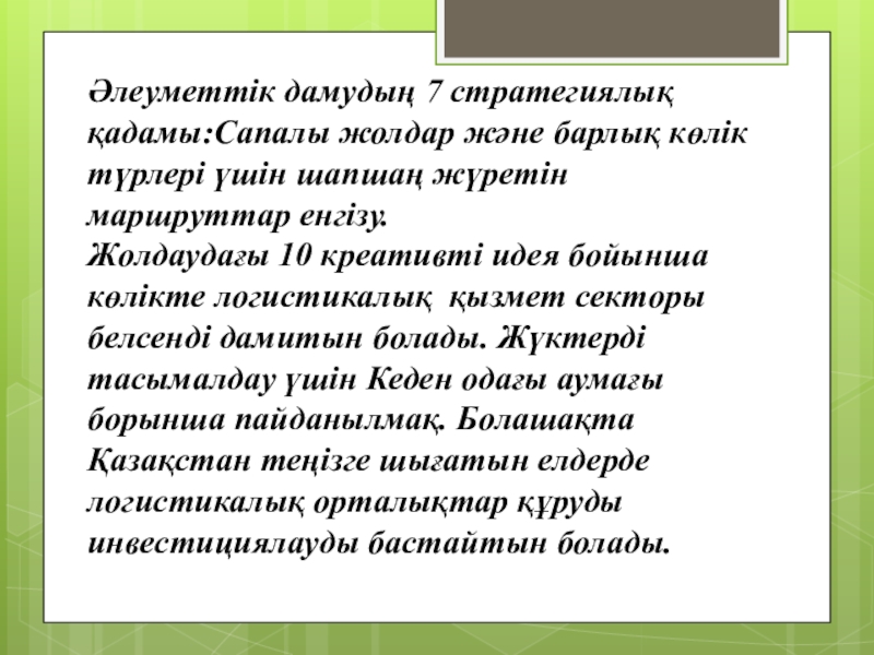 Слайд 91Әлеуметтік дамудың 7 стратегиялық қадамы:Сапалы жолдар және барлық көлік түрлері үшін