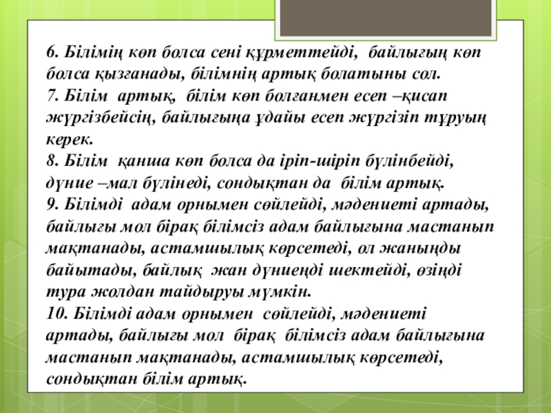 9. Білімді адам орнымен сөйлейді, мәдениеті артады, байлығы мол бірақ білімсіз адам байлығына мастанып мақтанады, астамшылық көрсетеді, ол жаныңды байытады, байлық жан дүниеңді шектейді, өзіңді тура жолдан тайдыруы мүмкін.