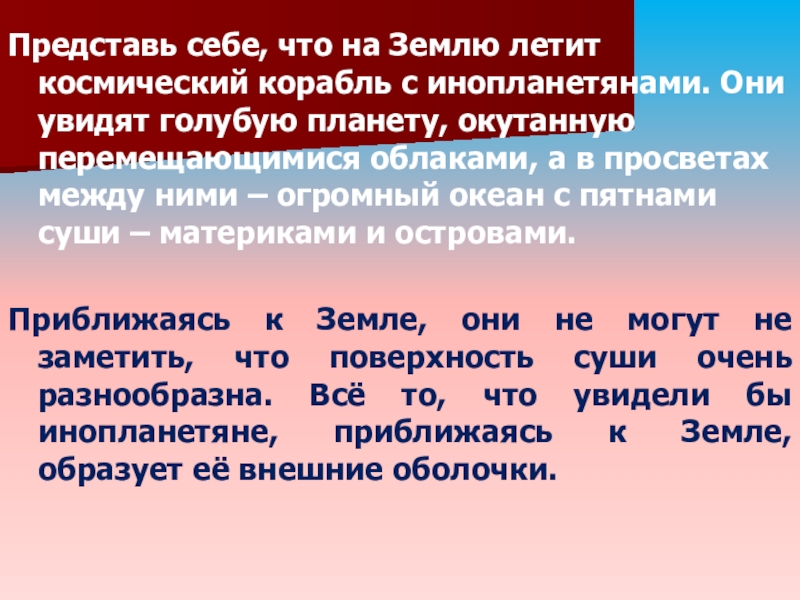 Приближаясь к Земле, они не могут не заметить, что поверхность суши очень разнообразна. Всё то, что увидели бы инопланетяне, приближаясь к Земле, образует её внешние оболочки.