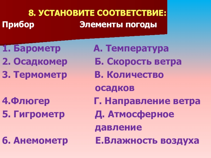 Слайд 12 8. УСТАНОВИТЕ СООТВЕТСТВИЕ:
