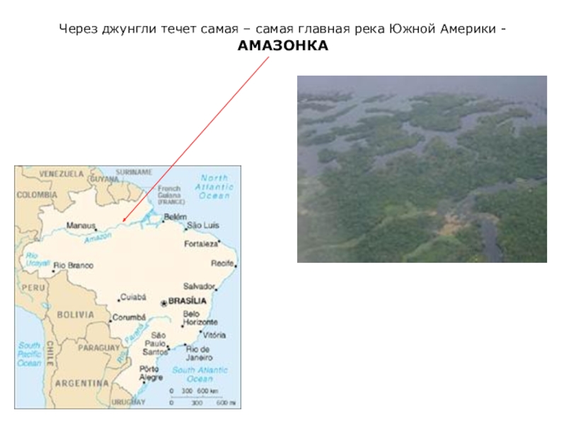 Но на самом деле это вовсе не тень тучки, а то место где Амазонка встречается с рекой Рио-Негро. Вода в Рио Негро такая прозрачная и чистая, что кажется черной. А вот вода Амазонки мутная и желтая из-за того, что ее течение переносит огромное количество ила. Амазонку иногда даже называют «белой» рекой.
