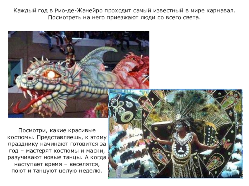 Посмотри, какие красивые костюмы. Представляешь, к этому празднику начинают готовится за год – мастерят костюмы и маски, разучивают новые танцы. А когда наступает время – веселятся, поют и танцуют целую неделю.