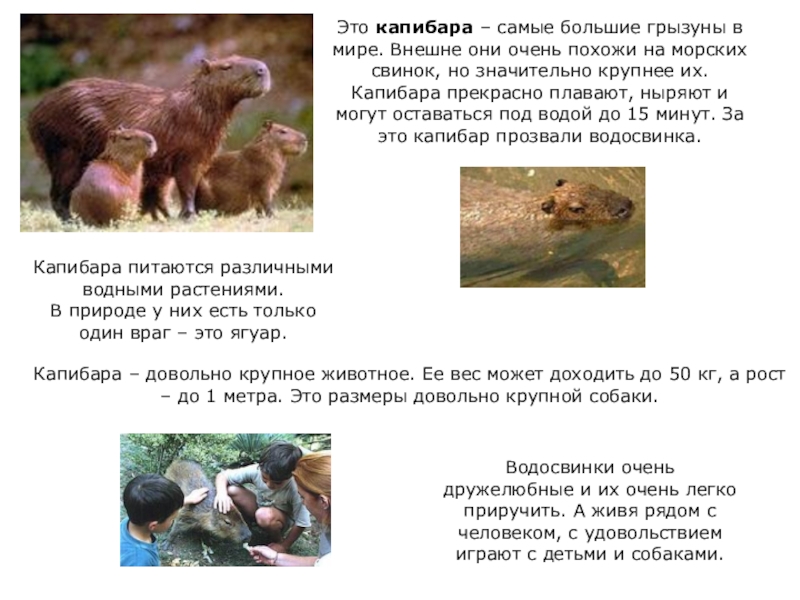 Водосвинки очень дружелюбные и их очень легко приручить. А живя рядом с человеком, с удовольствием играют с детьми и собаками.