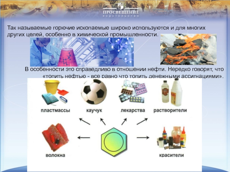 Слайд 10Так называемые горючие ископаемые широко используются и для многих других целей,
