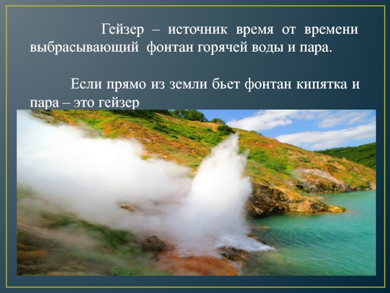 Гейзер – источник время от времени выбрасывающий фонтан горячей воды и пара.