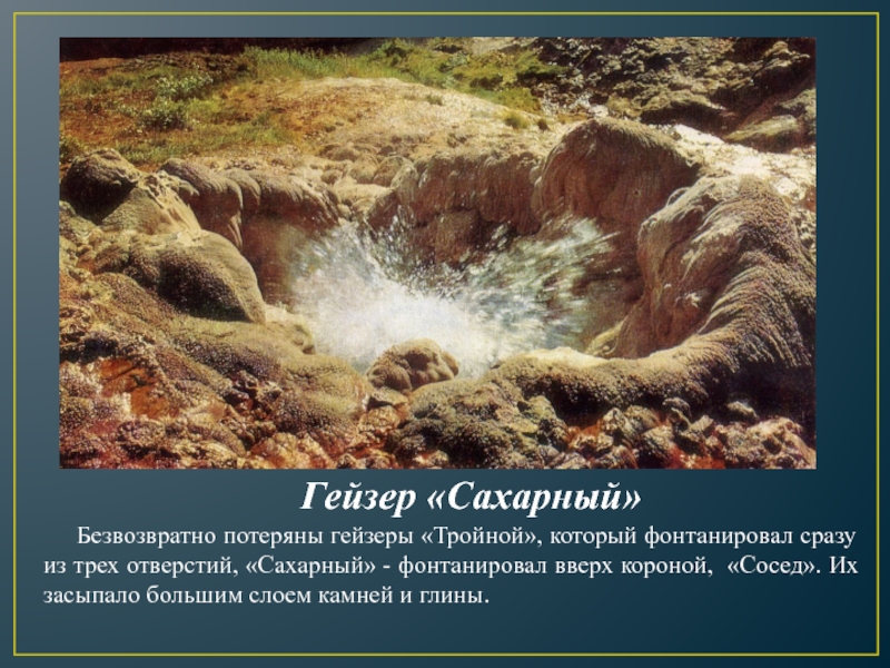Слайд 7 Безвозвратно потеряны гейзеры «Тройной», который фонтанировал сразу из