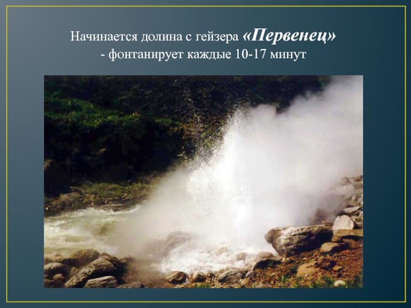 Слайд 5Начинается долина с гейзера «Первенец» - фонтанирует каждые 10-17 минут