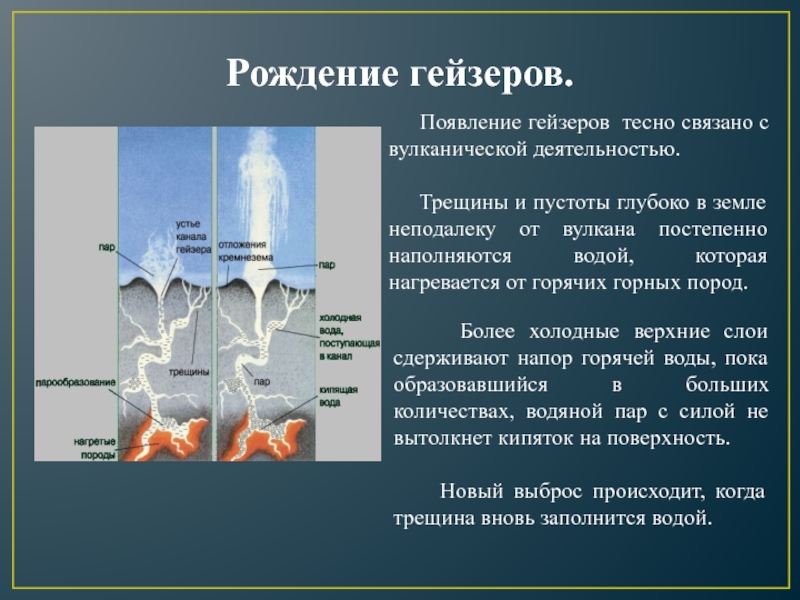 Рождение гейзеров.   Появление гейзеров тесно связано с вулканической деятельностью.   Трещины и пустоты глубоко