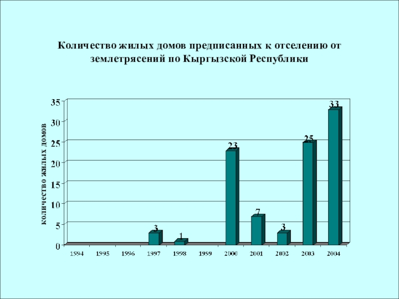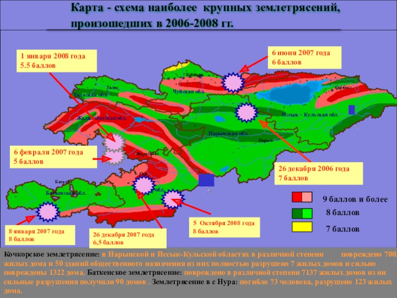 Кочкорское землетрясение: в Нарынской и Иссык-Кульской областях в различной степени повреждено 7003 жилых дома и 50 зданий общественного назначения из них полностью разрушено 7 жилых домов и сильно повреждены 1322 дома. Баткенское землетрясение: повреждено в различной степени 7137 жилых домов из ни сильные разрушения получили 90 домов . Землетрясение в с Нура: погибло 73 человека, разрушено 123 жилых дома.