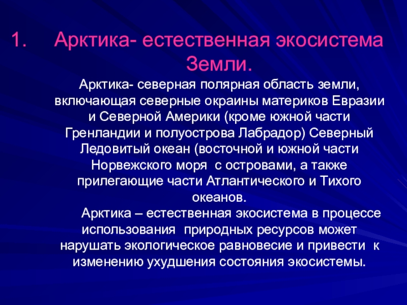 Арктика – естественная экосистема в процессе использования природных ресурсов может нарушать экологическое равновесие и привести к изменению ухудшения состояния экосистемы.