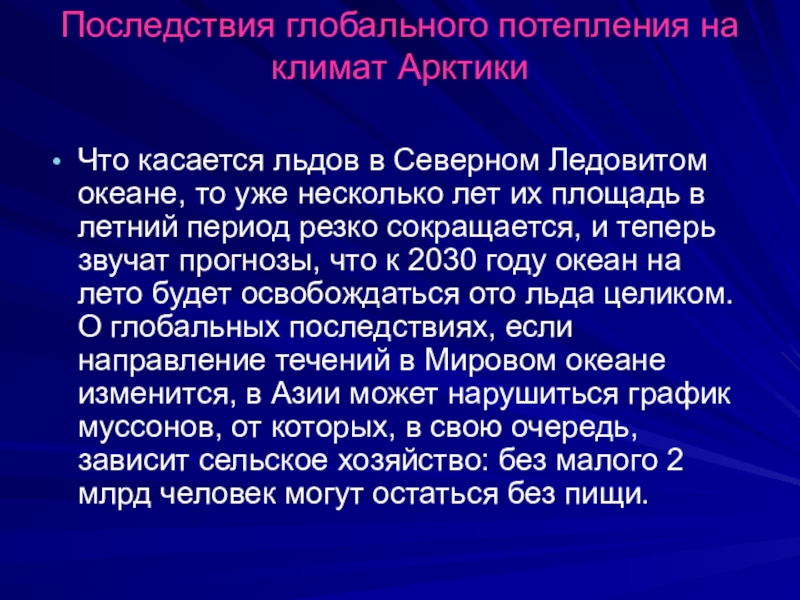 океане, то уже несколько лет их площадь в летний период резко сокращается, и теперь звучат прогнозы, что к 2030 году океан на лето будет освобождаться ото льда целиком. О глобальных последствиях, если направление течений в Мировом океане изменится, в Азии может нарушиться график муссонов, от которых, в свою очередь, зависит сельское хозяйство: без малого 2 млрд человек могут остаться без пищи.