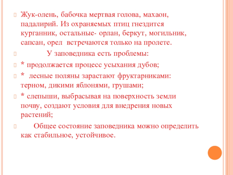 Общее состояние заповедника можно определить как стабильное, устойчивое.