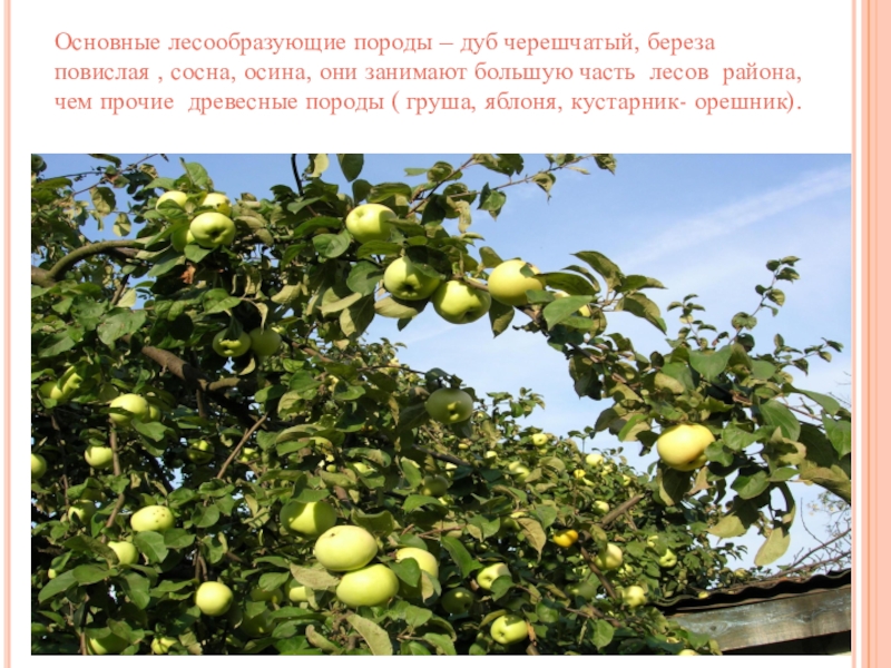 они занимают большую часть лесов района, чем прочие древесные породы ( груша, яблоня, кустарник- орешник).