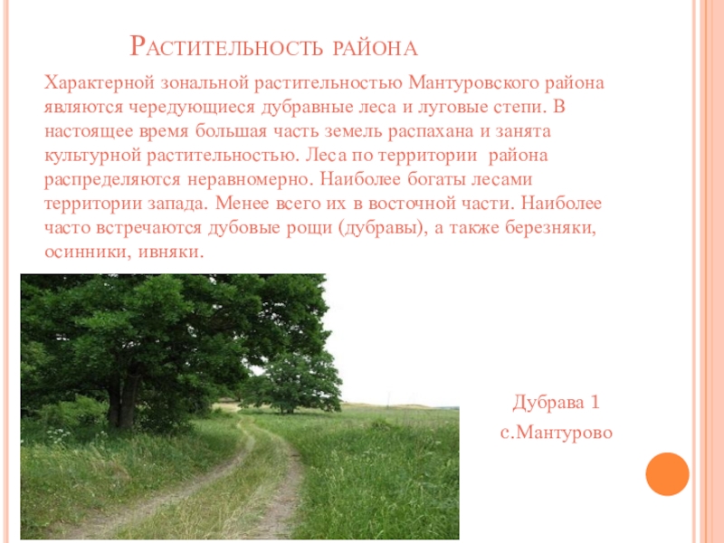 Характерной зональной растительностью Мантуровского района являются чередующиеся дубравные леса и