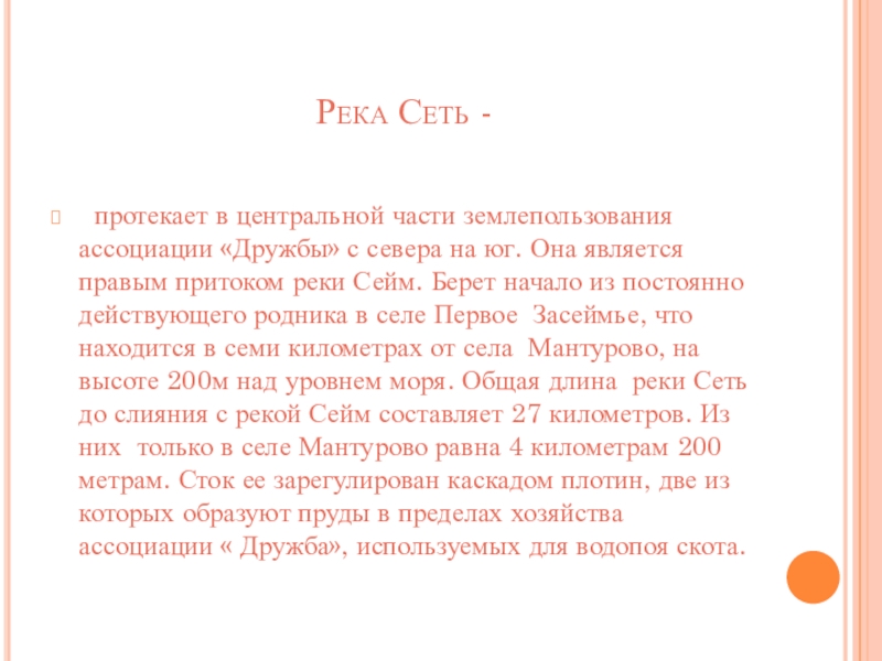 севера на юг. Она является правым притоком реки Сейм. Берет начало из постоянно действующего родника в селе Первое Засеймье, что находится в семи километрах от села Мантурово, на высоте 200м над уровнем моря. Общая длина реки Сеть до слияния с рекой Сейм составляет 27 километров. Из них только в селе Мантурово равна 4 километрам 200 метрам. Сток ее зарегулирован каскадом плотин, две из которых образуют пруды в пределах хозяйства ассоциации « Дружба», используемых для водопоя скота.