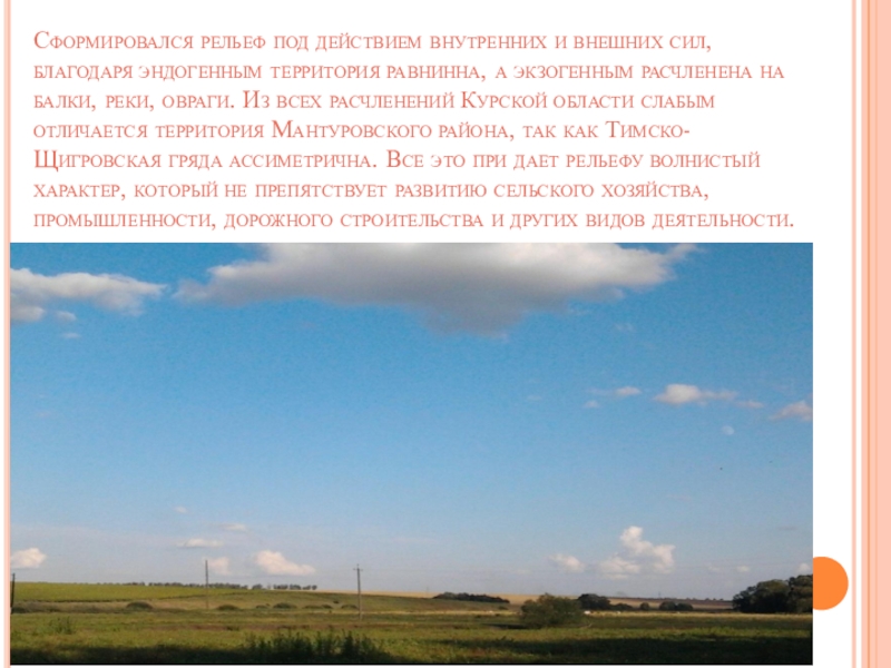 равнинна, а экзогенным расчленена на балки, реки, овраги. Из всех расчленений Курской области слабым отличается территория Мантуровского района, так как Тимско- Щигровская гряда ассиметрична. Все это при дает рельефу волнистый характер, который не препятствует развитию сельского хозяйства, промышленности, дорожного строительства и других видов деятельности.