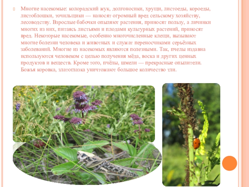 наносят огромный вред сельскому хозяйству, лесоводству. Взрослые бабочки опыляют растения, приносят пользу, а личинки многих из них, питаясь листьями и плодами культурных растений, приносят вред. Некоторые насекомые, особенно многочисленные клещи, вызывают многие болезни человека и животных и служат переносчиками серьёзных заболеваний. Многие из насекомых являются полезными. Так, пчелы издавна используются человеком с целью получения мёда, воска и других ценных продуктов и веществ. Кроме того, пчёлы, шмели — прекрасные опылители. Божья коровка, златоглазка уничтожают большое количество тли.