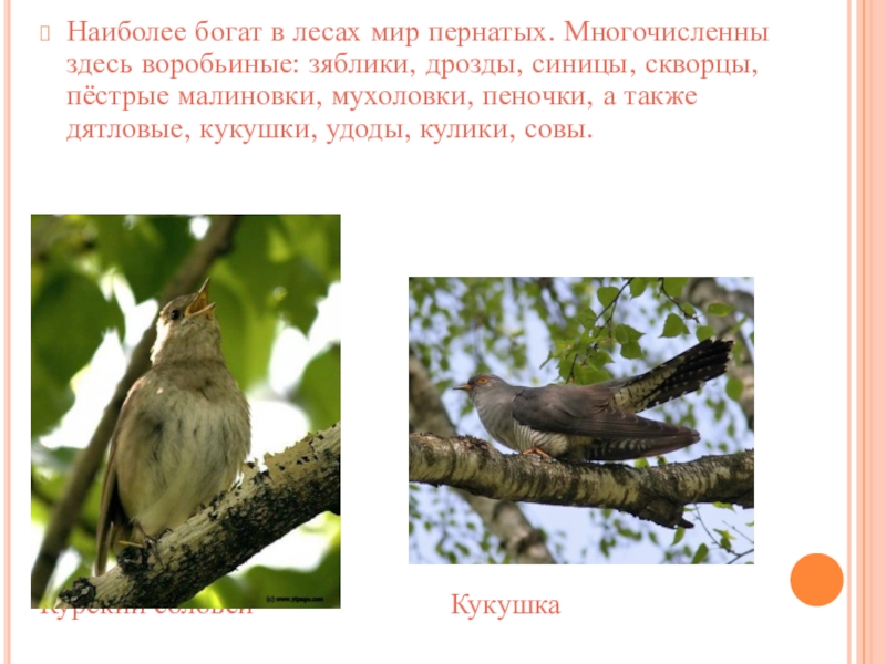Слайд 38Наиболее богат в лесах мир пернатых. Многочисленны здесь воробьиные: зяблики, дрозды,