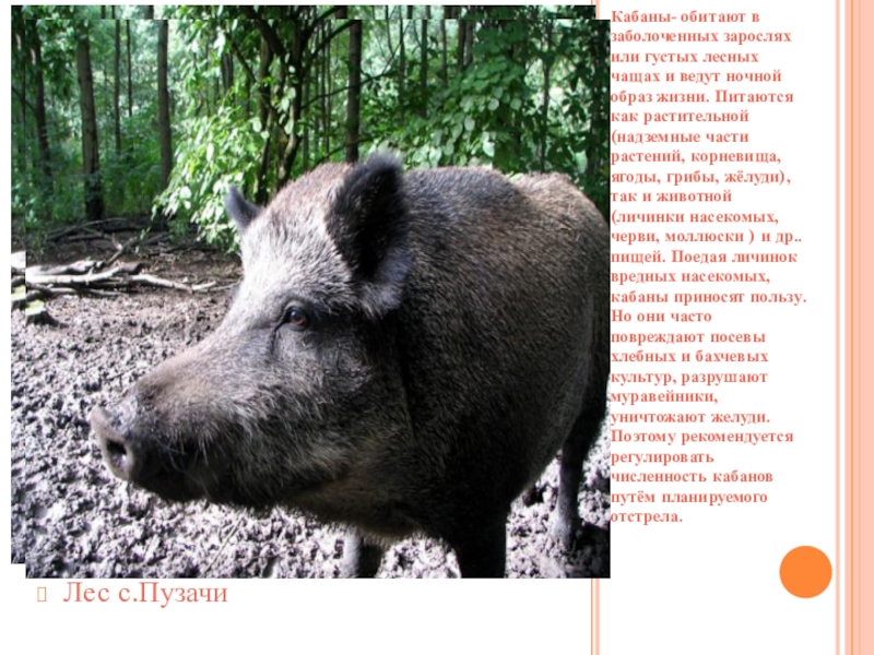 Слайд 37Кабаны- обитают в заболоченных зарослях или густых лесных чащах и ведут