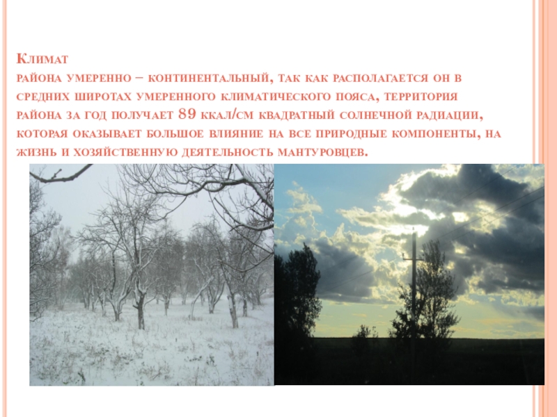 широтах умеренного климатического пояса, территория района за год получает 89 ккал/см квадратный солнечной радиации, которая оказывает большое влияние на все природные компоненты, на жизнь и хозяйственную деятельность мантуровцев.