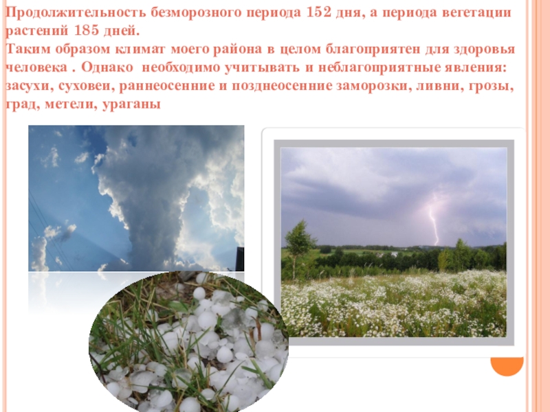 Слайд 17Продолжительность безморозного периода 152 дня, а периода вегетации растений 185 дней.
