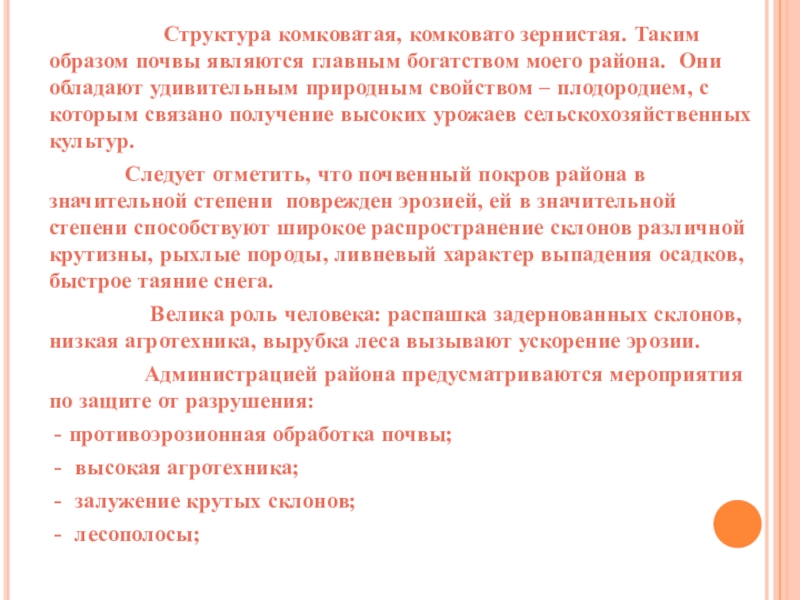 комковато зернистая. Таким образом почвы являются главным богатством моего района. Они обладают удивительным природным свойством – плодородием, с которым связано получение высоких урожаев сельскохозяйственных культур.