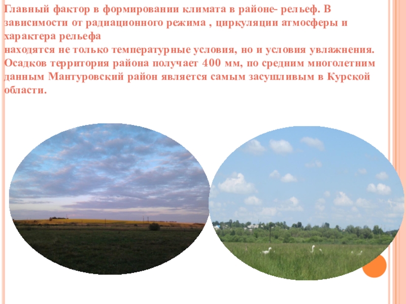Слайд 16Главный фактор в формировании климата в районе- рельеф. В зависимости от