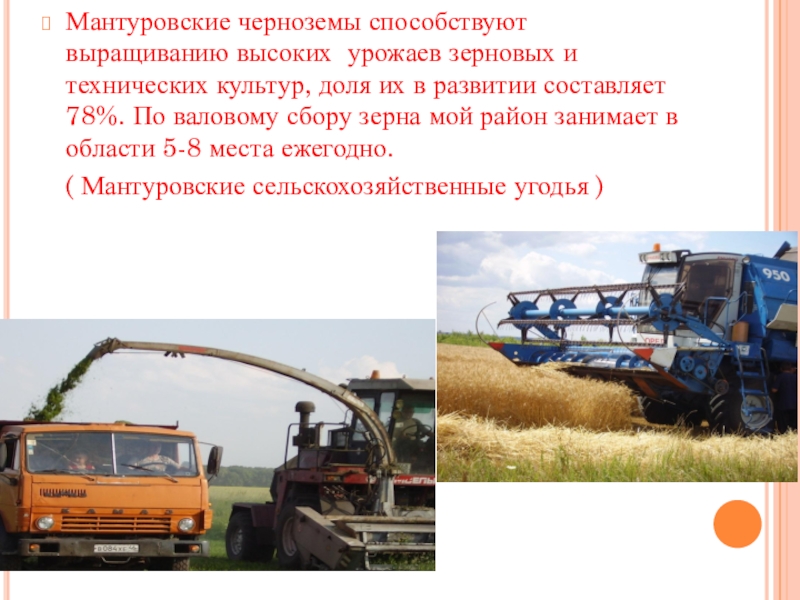 Слайд 33Мантуровские черноземы способствуют выращиванию высоких урожаев зерновых и технических культур, доля