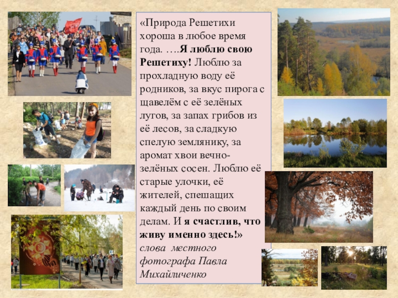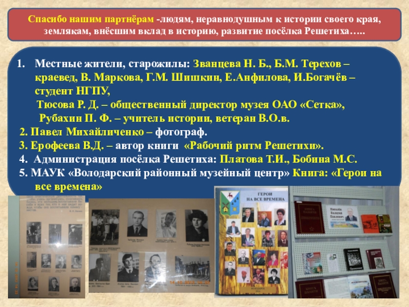 Местные жители, старожилы: Званцева Н. Б., Б.М. Терехов – краевед, В. Маркова, Г.М. Шишкин, Е.Анфилова, И.Богачёв – студент НГПУ,